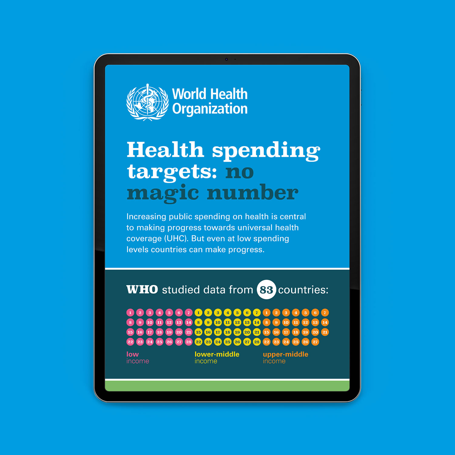 Commissioned by the Health Financing Policy team, the brief was to display health financing data for universal coverage from 83 countries in a simplified online visual graphic. It needed to show that high spending doesn’t necessarily lead to good results and that much can be achieved with low spending.
